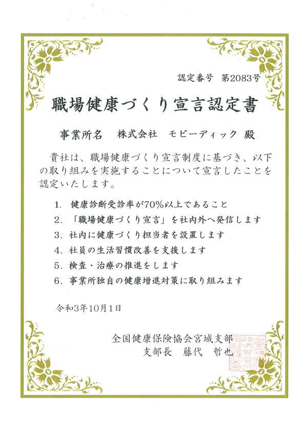 This time, it has been certified as a "Workplace Health Promotion Declaration" implemented by the Miyagi Branch of the Japan Health Insurance Association. We will continue to work on internal health promotion measures.