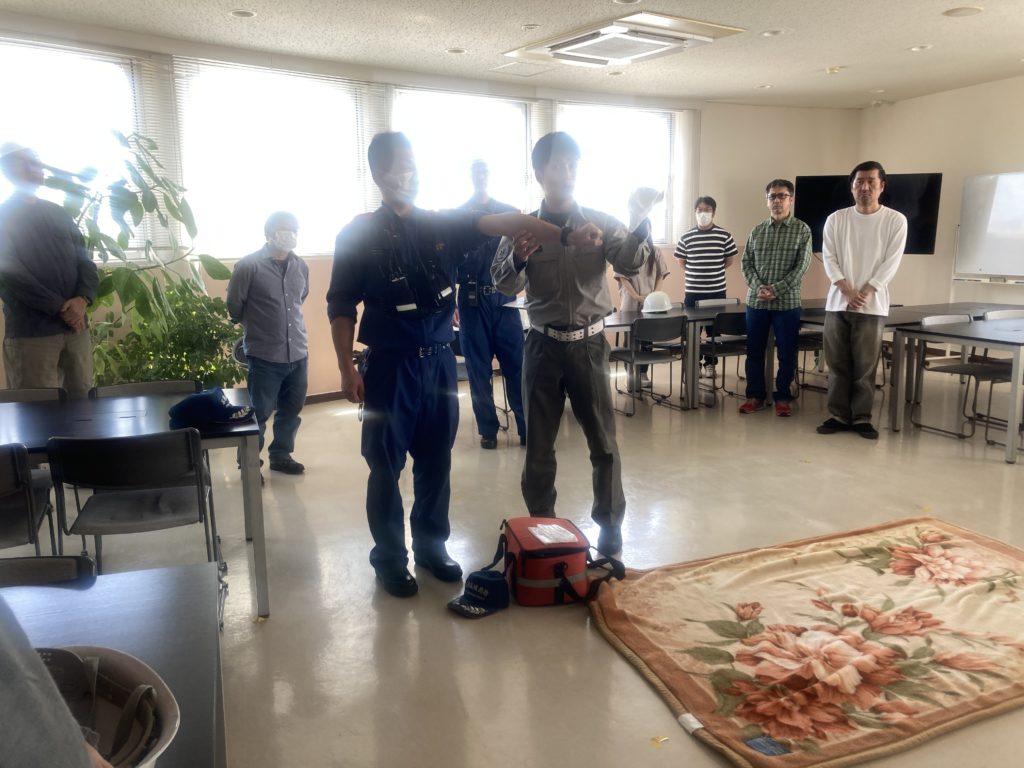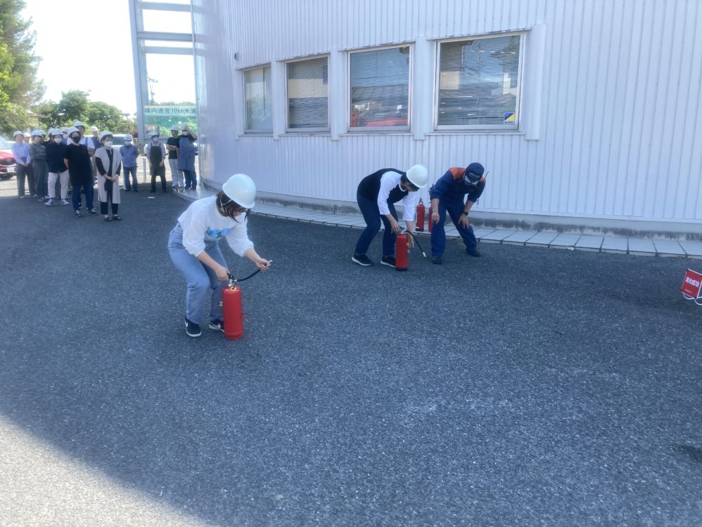 The drill was carried out with the cooperation of the local fire department and included evacuation guidance based on an earthquake scenario, first aid demonstrations, and hands-on fire extinguisher training outdoors.
